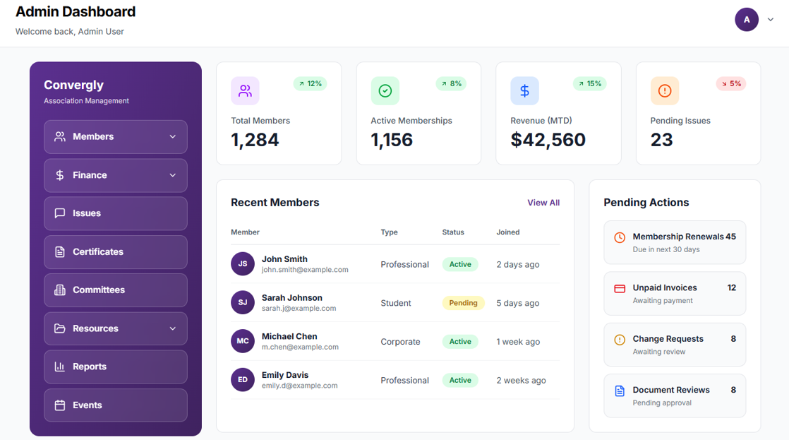 Replace spreadsheets and emails with one secure system. Convergly brings your members, renewals, invoices, and records together in one organised platform.